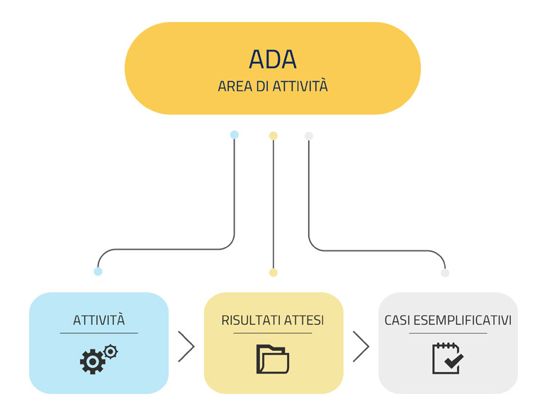 L’ADA è la principale unità informativa dell’Atlante, e contiene la descrizione delle singole attività che la costituiscono, i prodotti e i servizi attesi nonché i riferimenti ai codici statistici delle classificazioni ISTAT delle attività economiche e delle professioni.